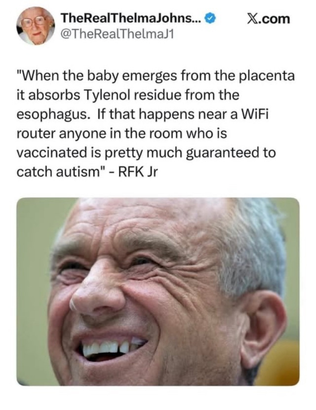 "In case you missed it: RFK Jr, the guy who plays a doctor on TV and is in charge of America's healthcare, now says boys are more likely to catch the autism because Tylenol after circumcisions.