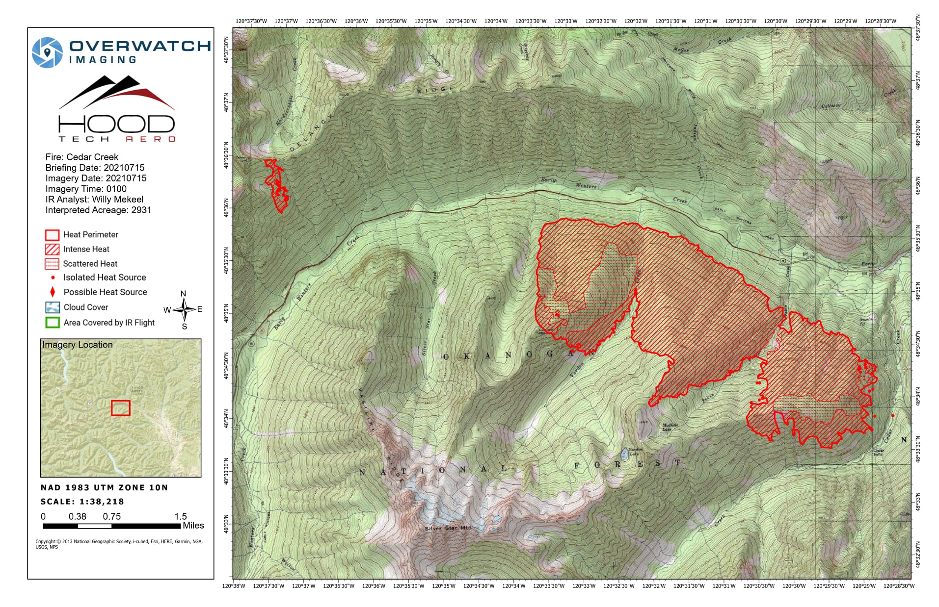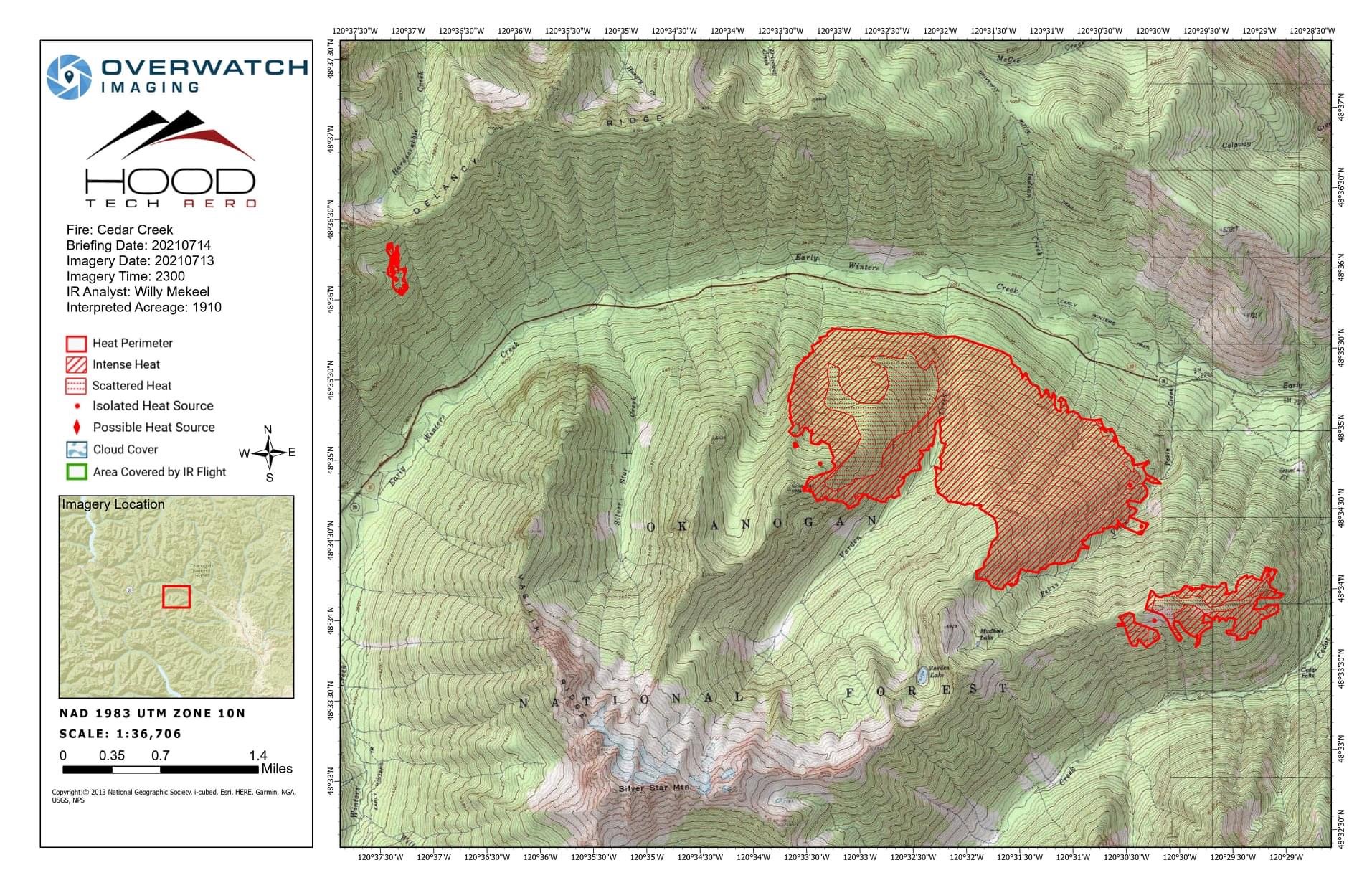 Cedar Creek and Delancy fire perimeters near Mazama, WA. July 16, 2021