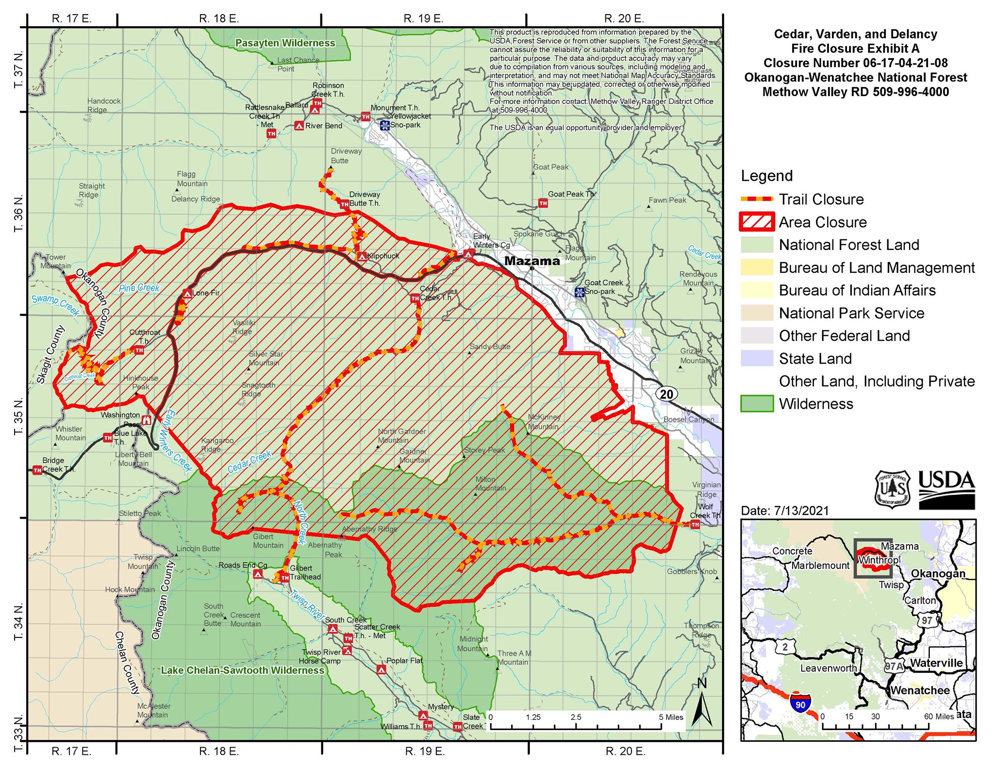 The Okanogan-Wenatchee National Forest has implemented a Fire Emergency Area Closure as of July 15, 2021. The Closure includes facilities, roads, and trails. The Closure may be viewed in its entirety at the “Cedar Creek and Delancy Fires 2021” Facebook page.