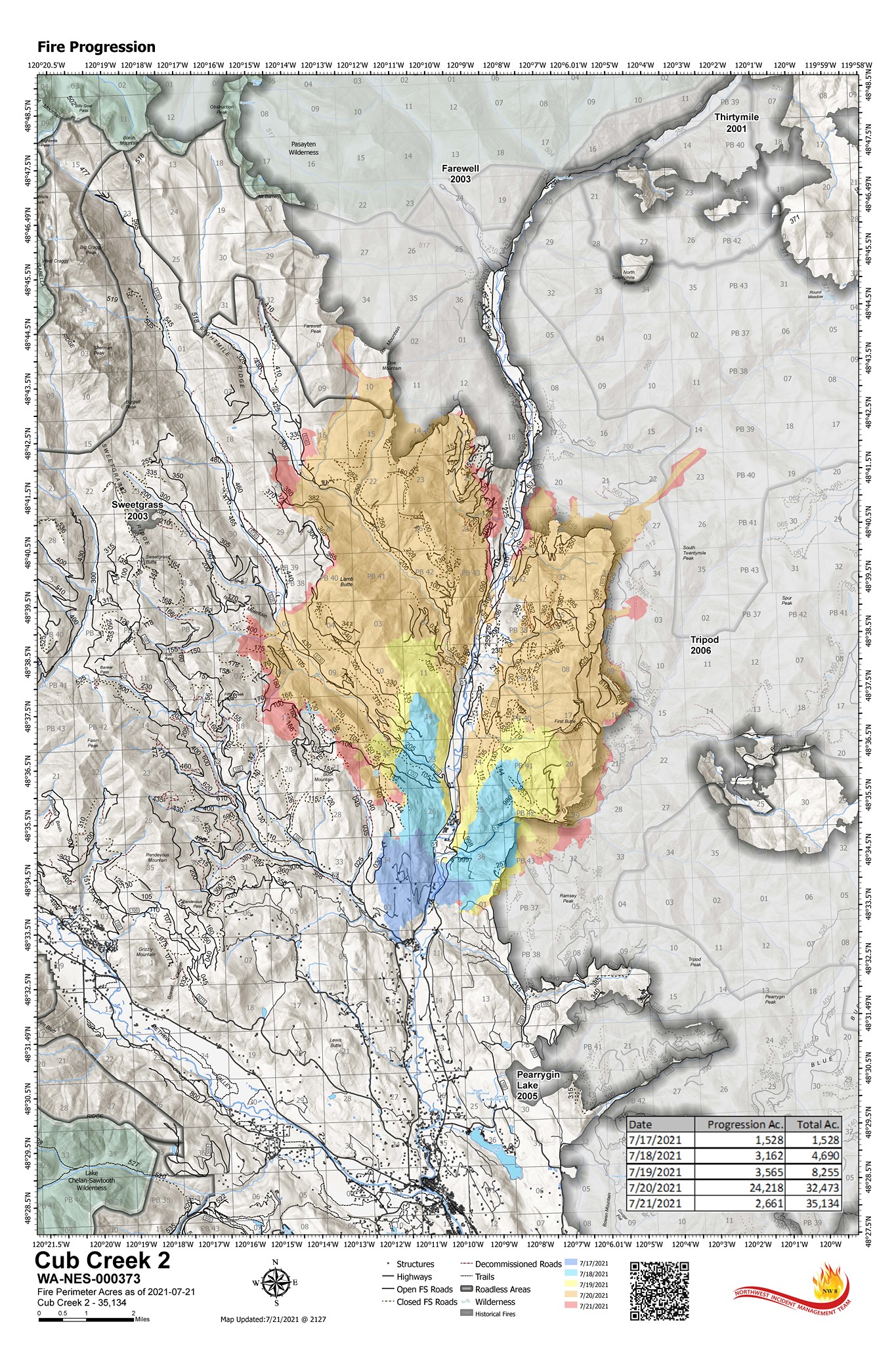 Winthrop, WA — Cub Creek 2 – The Cub Creek 2 Fire is estimated at 32,473 acres with 5% containment. The fire is burning northward with lateral growth east and west influenced by diurnal winds. Fire growth has been consistent for several operational periods at ¼ mile per hour. Firefighting efforts have benefited in areas where the fire has merged into past burned areas and areas that have received previous fuel treatments.
