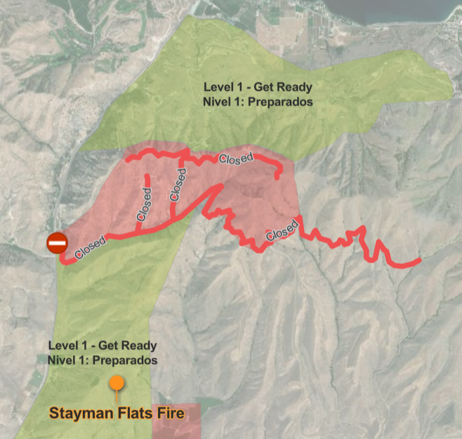 Update 7/18 at 4:50 pm: Level 1 (get ready) evacuation notices have been issued in the areas of Stayman Flats Road and 97A from Knapps Hill tunnel to Downey Canyon on the east side of the road.