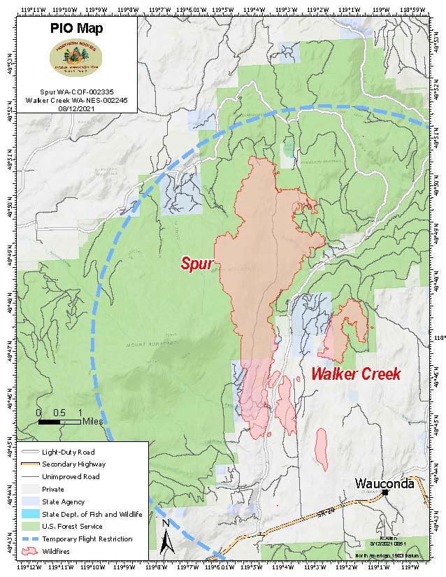 EVACUATIONS: Level 3 evacuations remain in effect for the Spur and Walker Creek Fire areas. ROAD CLOSURES: We appreciate all the support from the local communities and remind you that firefighter and public safety is our number one priority. Visitors to the Forest may see road closures that are in place to protect the public from firefighting operations. Please respect closures and barricades! Know BEFORE you Go! Temporary Flight Restrictions (TFR): There is a TFR in place for air space over Fire Areas. Remember that temporary flight restrictions also apply to unmanned aircraft systems (UAS) or drones. If you Fly, We Can’t! Cooperating Agencies: Okanogan Emergency Management Division, Washington DNR, USDA Forest Service.