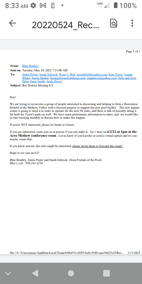 Here is the email where Blue states they were Considering an Aquatics Center for both Twisp and Winthrop.