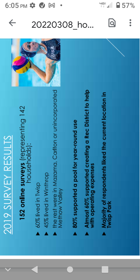 For instance, in conversations with Senator Brad Hawkins recently, he suggested perhaps a public facilities district as opposed to a recreation district that would be funded by sales tax on a county wide basis may be a better fit. He is working on enabling legislation for Chelan and Douglas County for this purpose. If we were to undertake that approach, it would take county-wide participation and perhaps enable other communities to plan and upgrade their local pools as well. I know Brewster is in need of upgrading and I can only imagine Omak and Okanogan are also in need of replacements soon. As of now we are moving forward with a valley-wide recreation district approach, but it would be good to have these conversations with you prior to launch of any campaign.