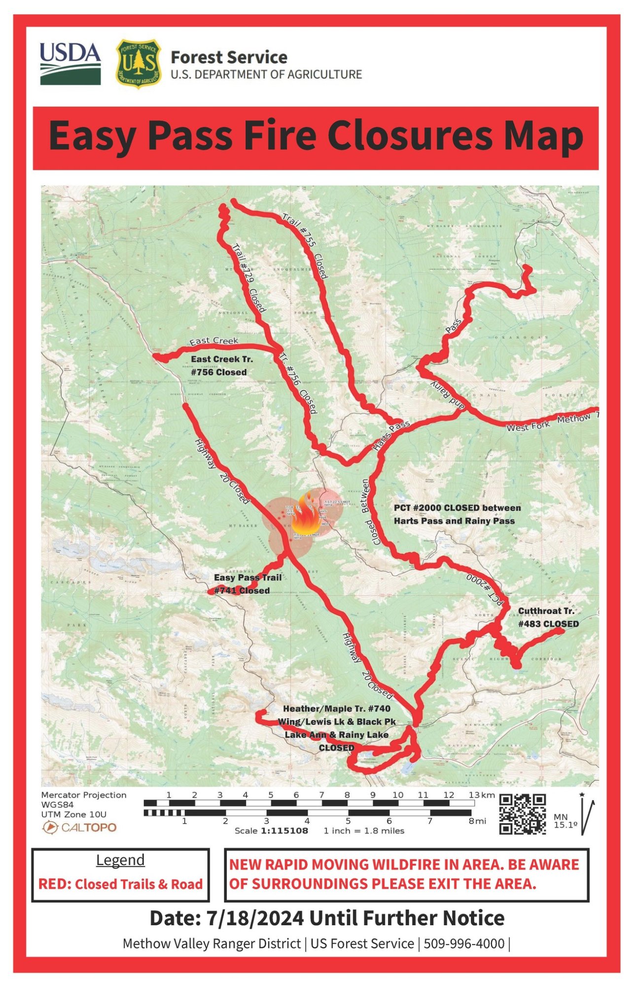 The Okanogan-Wenatchee National Forest has closures in place for trails within the fire area: https://bit.ly/EasyFireClosures. Campfires are prohibited. There is a Temporary Flight Restriction (TFR) in place over the fire: https://tfr.faa.gov/save_pages/detail_4_6779.html. Unauthorized drone activity is prohibited under the TFR.