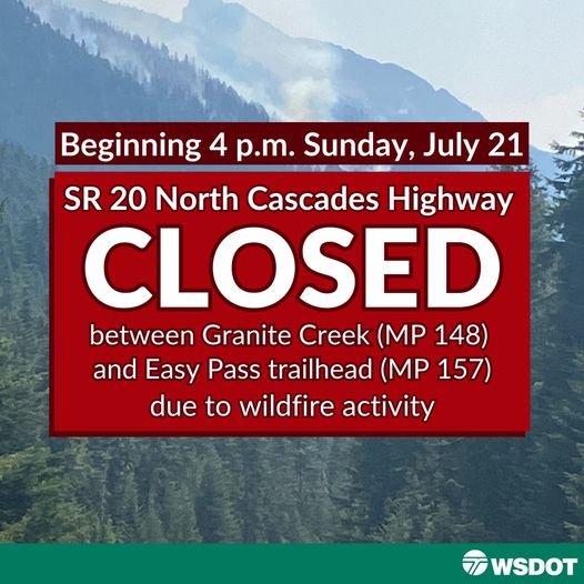 Easy Fire - Effective at 4pm on Sunday July 21, WSDOT will be closing State Route 20 will be closed due to wildfire and fire mitigation activity in the area. Please visit https://wsdot.com/Travel/Real-time/Map/ for the latest on this closure.