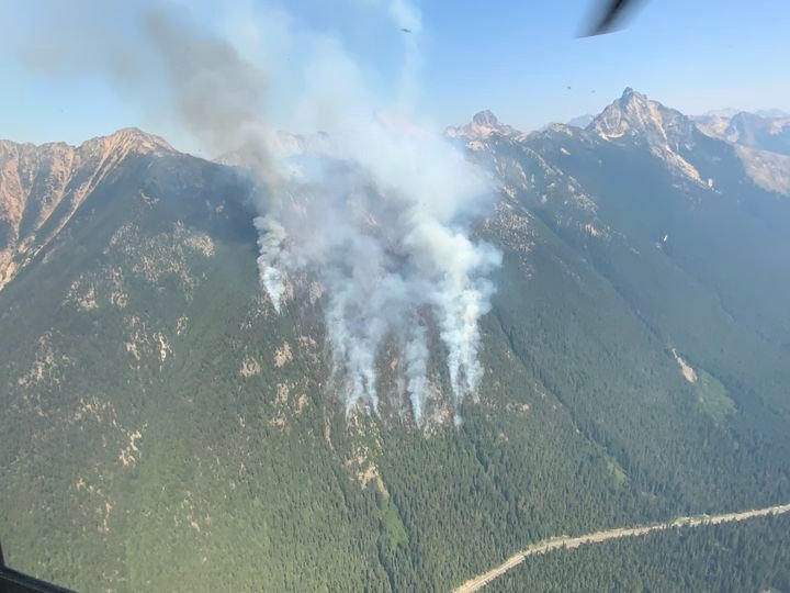 Aerial View of the Easy Fire on Saturday, July 20. The Easy Fire is burning in steep terrain above State Route (SR) 20. In the past couple days, the fire has backed down the slope and is close to SR 20. With hazards such as rolling rocks, falling trees and active fire, the highway is closed between Granite Creek (milepost 148) and the Easy Pass trailhead (milepost 157). Crews are working on removing dead trees between the fire and the highway. For the latest on the highway road closure, visit https://wsdot.com/Travel/Real-time/Map/