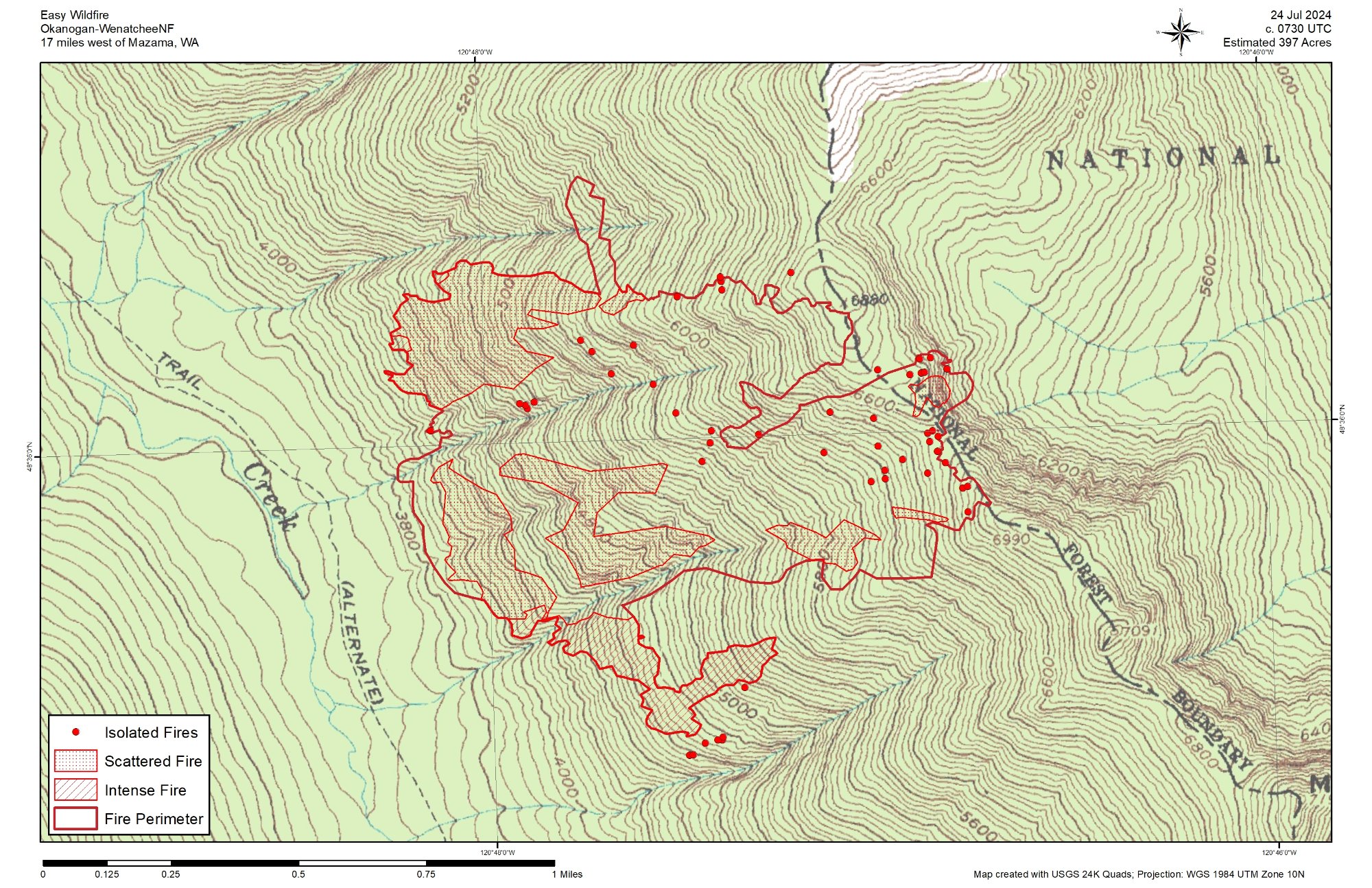 CURRENT SITUATION: Easy Fire is burning in large dense timber with abundant dead trees and extensive ground vegetation. The terrain is extremely steep. Continued hot, dry, and unstable weather conditions on Monday led to very active fire behavior including torching, or fire climbing from the ground to the tops of trees. Short range spotting, where embers are cast out in front of the fire, also contributed to fire spread. Easy Fire extends over Mt. Hardy, threatening the Pacific Crest Trail (PCT), while also moving down slope toward State Route 20 (SR 20) North Cascades Highway.