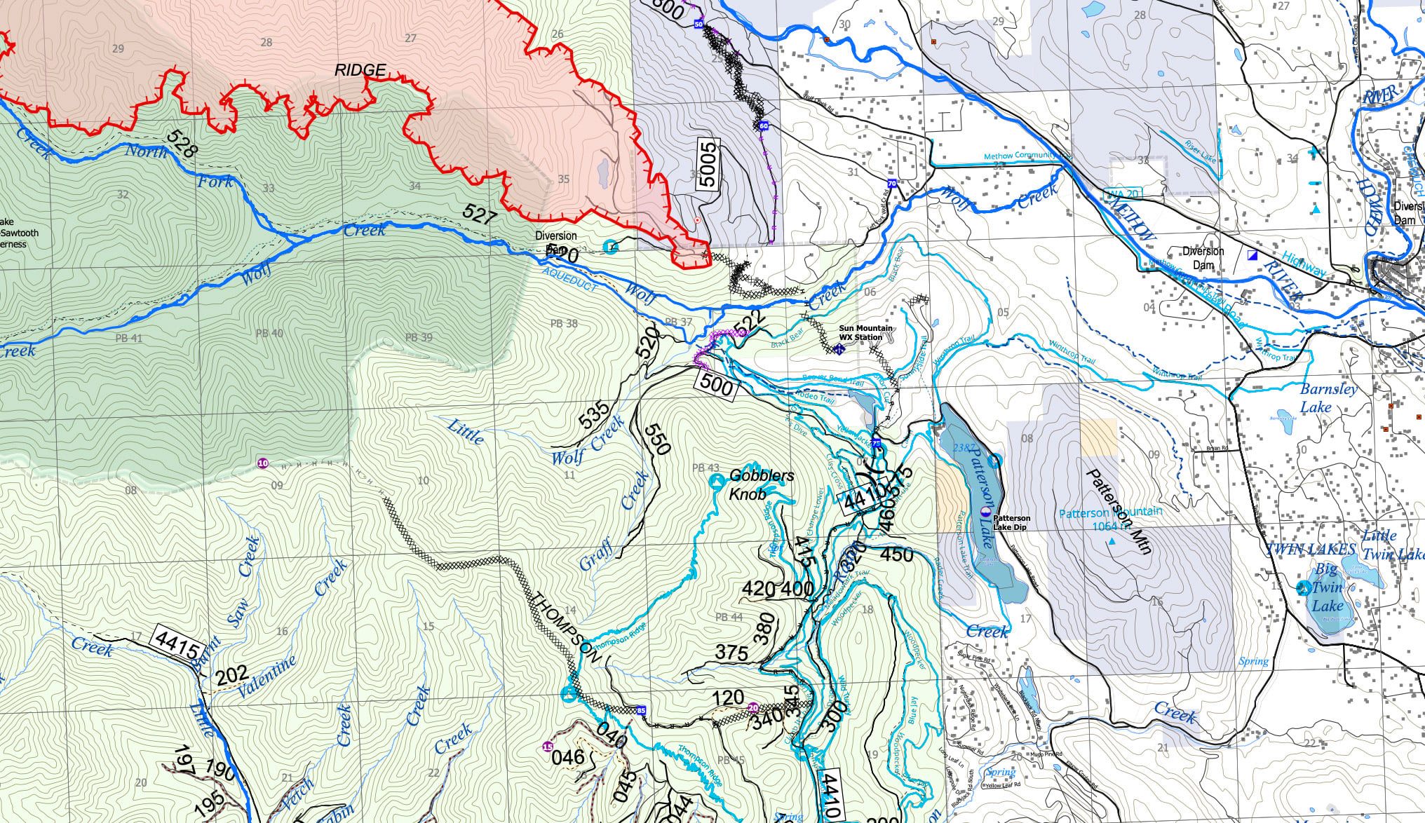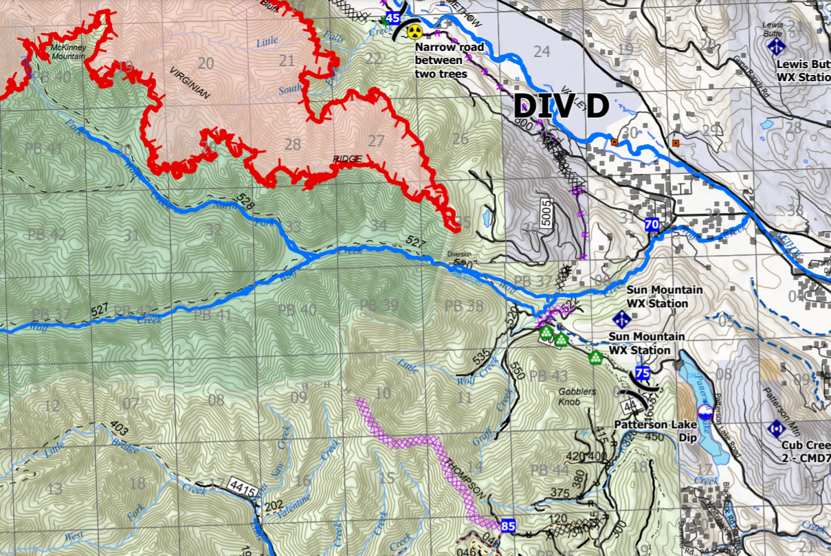 Here's the Thompson Ridge and Sun Mountain planned fire line map from 7/25, overlaid with Sun Mountain trails (blue) via Trailforks. It looks like there will be dozer line near Lower Fox, dozer up from Black Bear to View Ridge at Sun Mtn and down to Sunnyside and the Sun Mountain road. Then they'll use Thompson Ridge Rd to the crest, open an old road near the top to connect with FS100 and the new Thompson Ridge trail, then push NW with a combination of dozer and hand line along the wilderness boundary. The northern half of the Thompson Ridge Trail, Gobblers Knob and Lower Climate will be inside the line, as will Beaver Pond, Rodeo, Overland etc.
