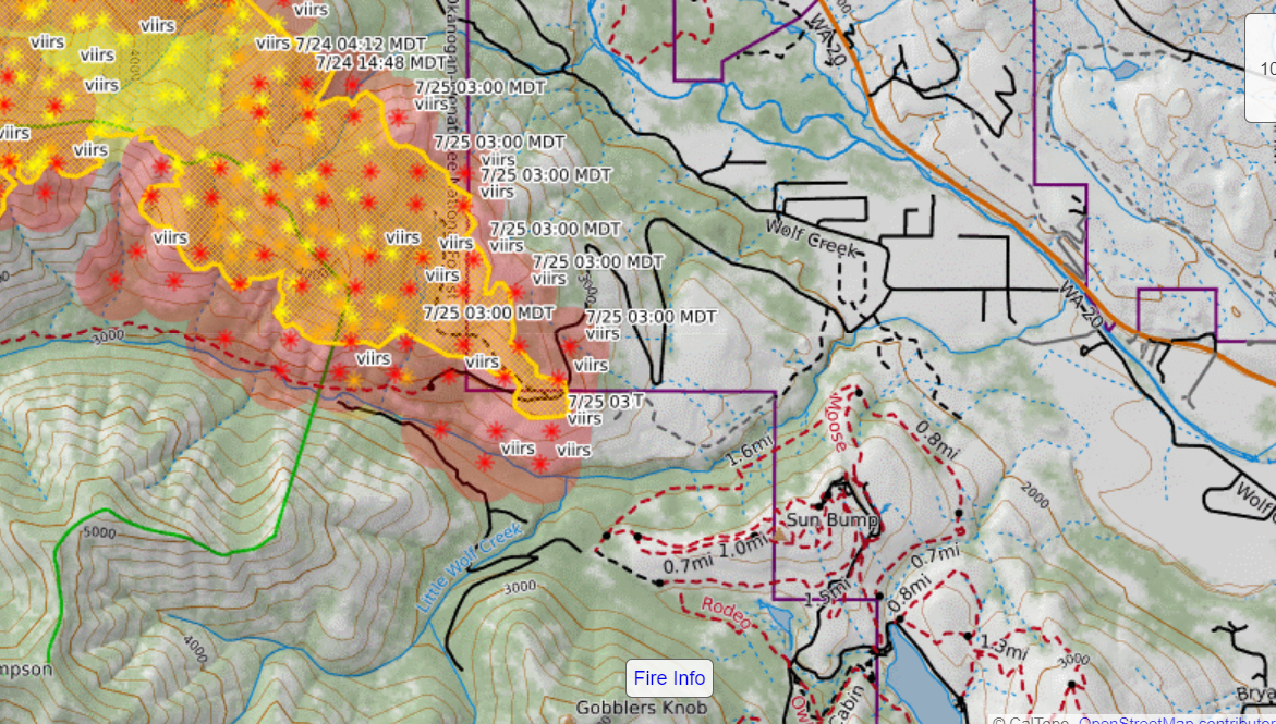 The fire remains split into east and west flanks actively burning on all sides. Both of the flanks continue to move in the northern section toward previously burned areas from the Mcleod and Tripod fires. These fire scars are moderating fire behavior. On the southern portion of the fire, crews will continue to strengthen control lines to limit fire spread towards Winthrop.