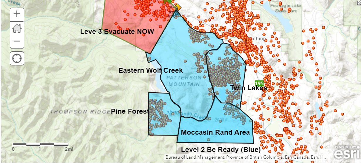 Level 2 (Be ready) issued for the Eastern area of the Wolf Creek Area starting at the Wolf Creek Bridge, east towards Winthrop along the Methow River to the Winthrop Fish Hatchery then south on Twin Lakes Road to Patterson Lake Road to the north end of Patterson Lake. (Name of Zone Eastern Wolf Creek)