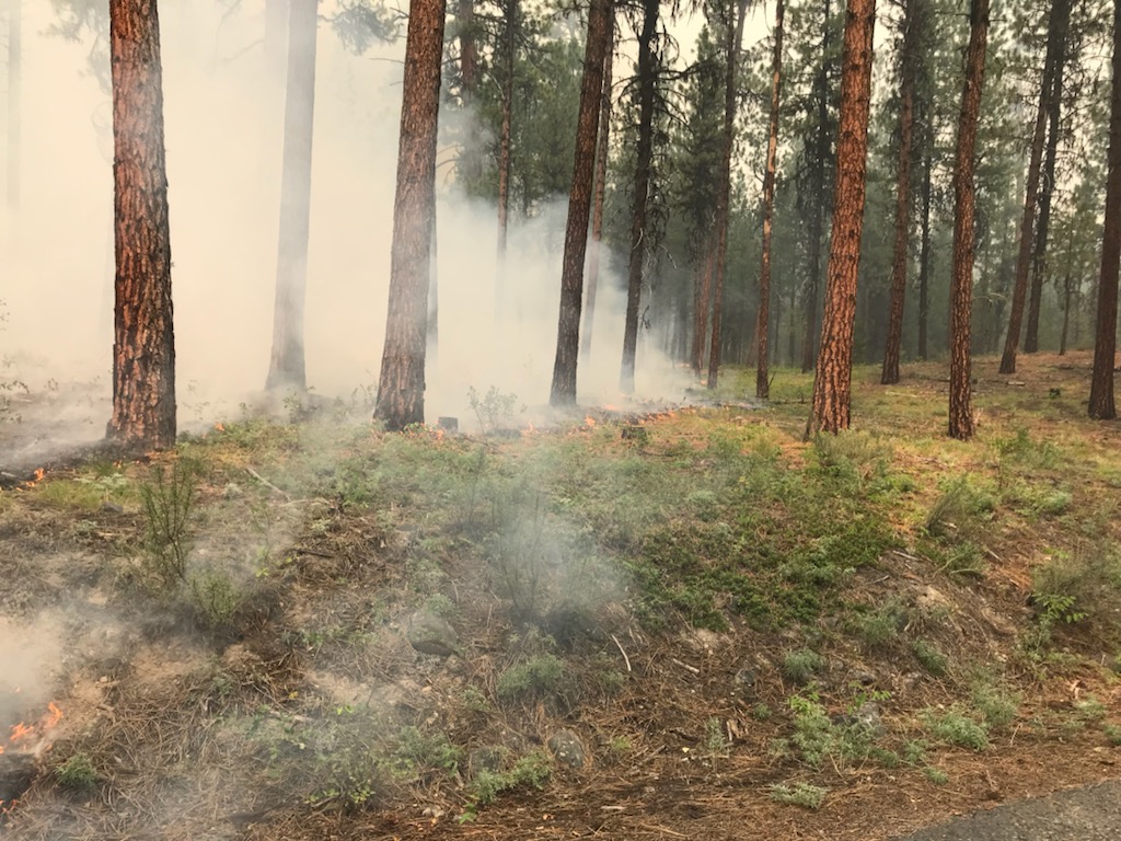 Past fuel treatments along the Chewuch River drainage near the Brevicomis cabins has helped lower fire intensity in this area. As you can see in this photo, the fire in this area is mostly a low intensity, ground fire backing towards the road similar to the effects of a prescribed fire. Firefighters are remaining vigilant in this area to maintain the progress made in structure protection.