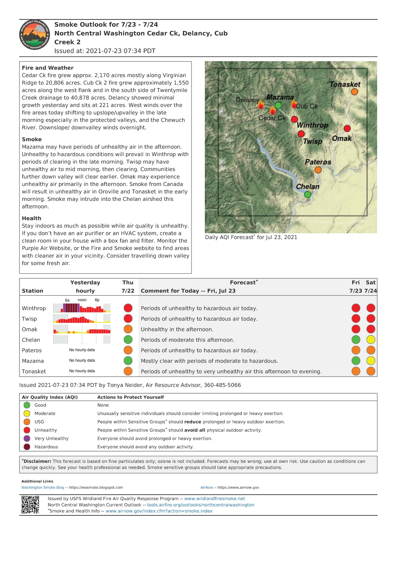 Air Quality: Conditions today were similar to yesterday and air resources were able to fly, although delayed. Unhealthy to hazardous conditions may occur in the Upper Methow Valley east of Mazama from early morning to mid-afternoon. Communities further down valley may experience unhealthy air. Smoke has spilled over into the Okanogan Valley. Tonasket and Omak may experience unhealthy air throughout the day. Oroville is receiving heavy smoke from Canada and the Methow Valley. Chelan may start having hazy skies. Conditions should improve overnight. Smoke will return in the morning but should be better than today.