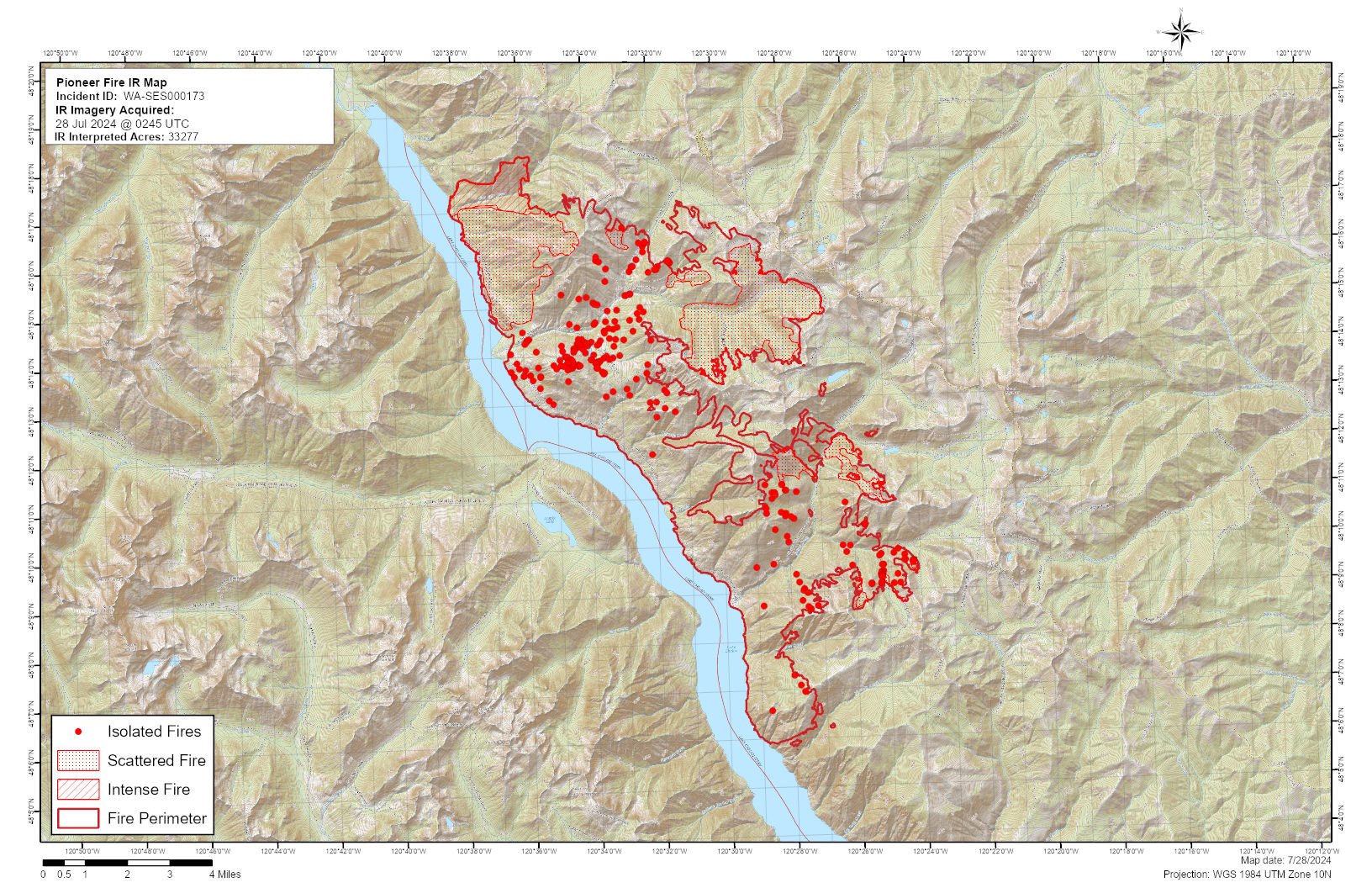 The Pioneer Fire crossed Fourmile drainage yesterday and progressed further north. This fire movement has prompted @Chelan County Emergency Management to issue a Level 3 (Go Now) notice for Stehekin starting July 28 at 8am. For more details about the notice and transport information see https://www.facebook.com/CCSOEM/posts/p ... PUJTBzqTTl
