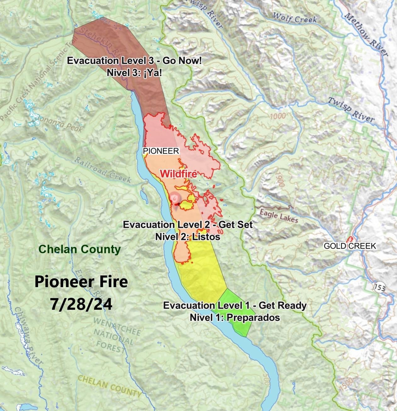 Pioneer Fire Update: Level 3 evacuation notice (Get out now!) effective 8 a.m. Sunday, July 28, for Stehekin