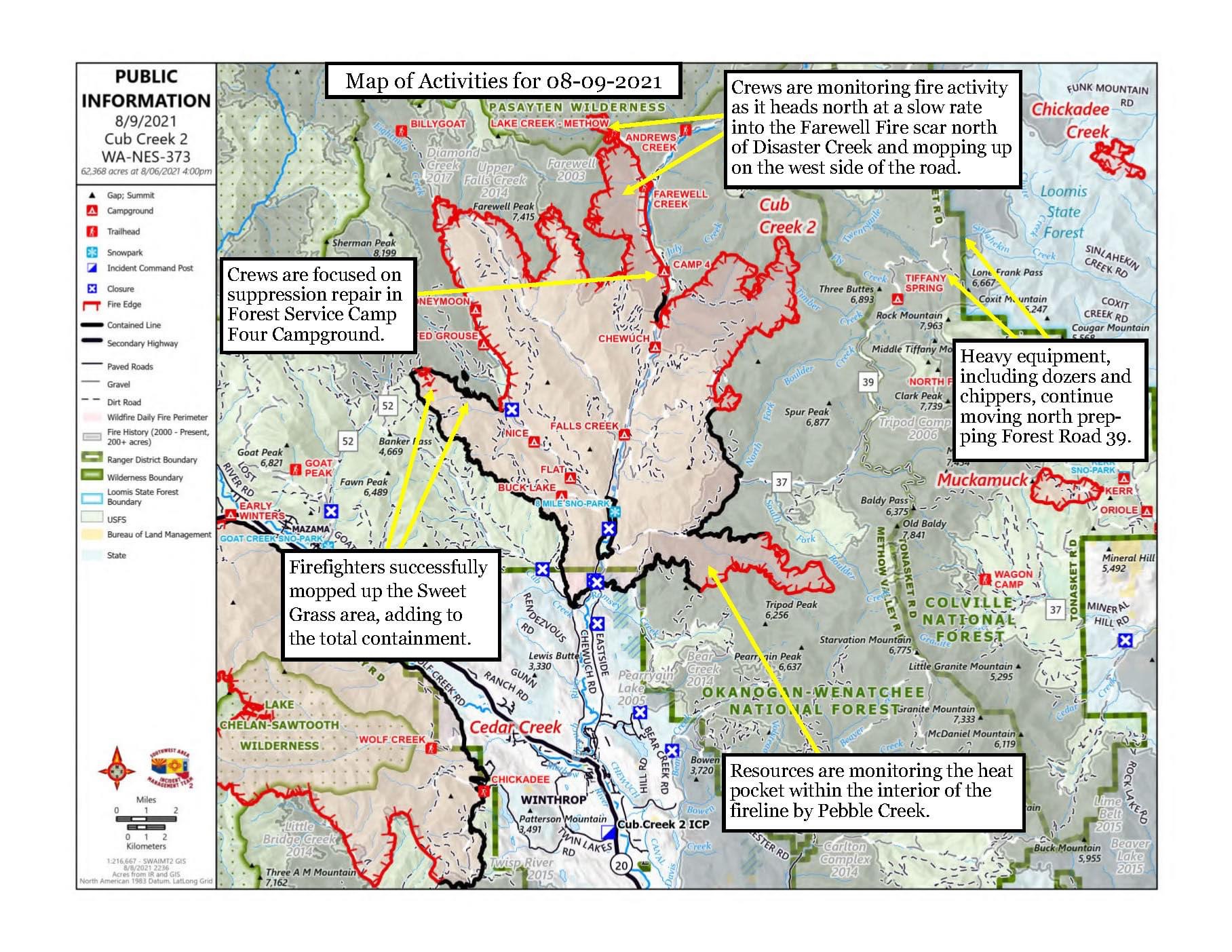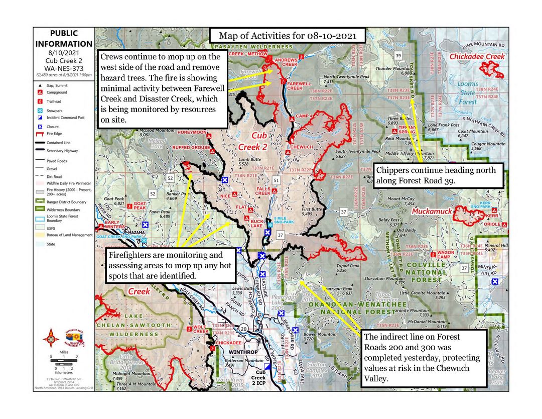 Mop up continues along the western flank of the fire, and firefighters are monitoring and assessing areas to mop up any hot spots that are identified. Along Forest Road 51, crews continue to mop up on the west side of the road and remove hazard trees. The fire is showing minimal activity between Farewell Creek and Disaster Creek, which is being monitored by resources on site. Chippers continue heading north along Forest Road 39. The indirect line on Forest Roads 200 and 300 was completed yesterday, protecting values at risk in the Chewuch Valley. The heat pocket near Pebble Creek still shows a little activity, and continues to be monitored.