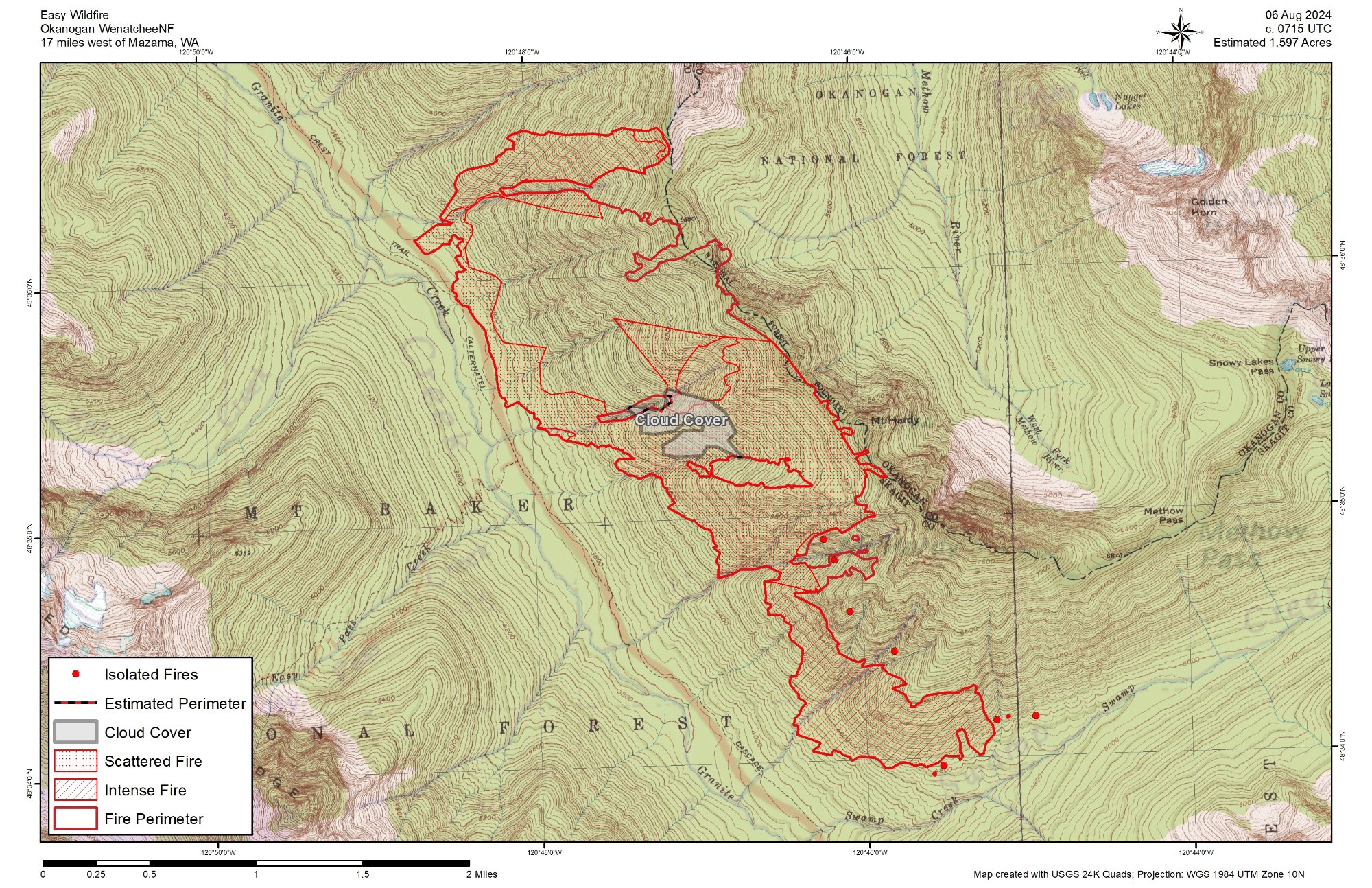 CLOSURES: State Route 20 is closed in both directions between Granite Creek (MP 148) and Rainy Pass (MP 157): https://wsdot.com/Travel/Real-time/Map/ . State Route 20 will remain closed through the weekend as crews continue working to mitigate hazards. Washington Department of Transportation will reevaluate conditions on Monday August 12, 2024. The Okanogan-Wenatchee National Forest has closures in place for trails within the fire area: https://bit.ly/EasyFireClosures . This closure includes a portion of the Pacific Crest Trail. Campfires are prohibited. There is a Temporary Flight Restriction (TFR) in place over the fire: https://tfr.faa.gov/save_pages/detail_4_6779.html. Unauthorized drone activity is prohibited under the TFR.