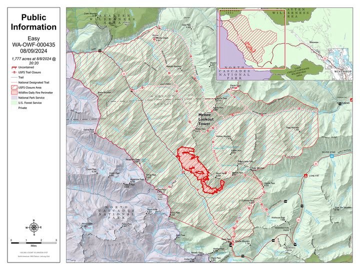 CLOSURES: State Route 20 is closed in both directions between Granite Creek (MP 148) andEasy Pass Trailhead (MP 157): https://wsdot.com/Travel/Real-time/Map/ . The Okanogan-Wenatchee National Forest has closures in place for trails within the fire area: https://bit.ly/EasyFireClosures . This closure includes a portion of the Pacific Crest Trail. Campfiresare prohibited. There is a Temporary Flight Restriction (TFR) in place over the fire: https://tfr.faa.gov/save_pages/detail_4_6779.html . Unauthorized drone activity is prohibited underthe TFR.