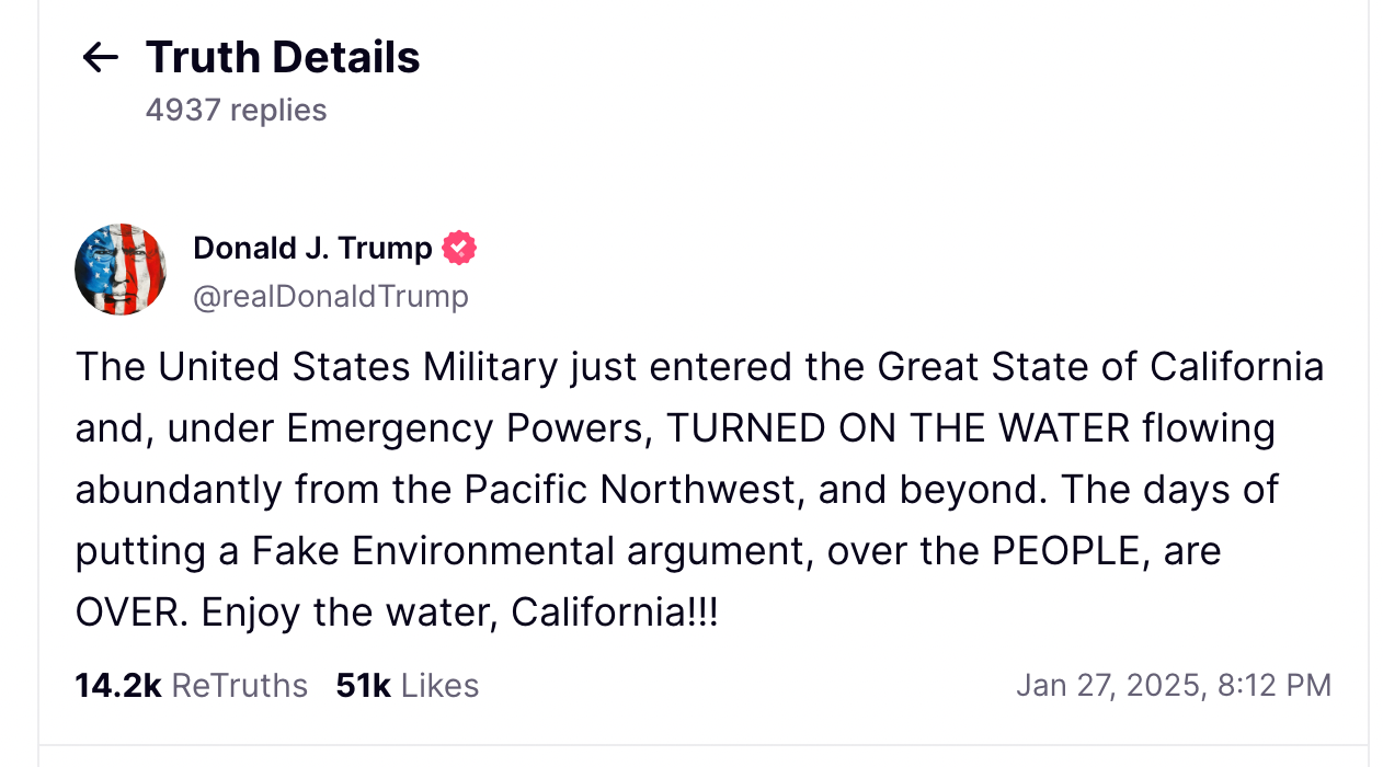 Tristan; except he's not Read the articles. None of the water makes it to Southern California. It is flooding towns and agricultural land and is happening simultaneously with an atmospheric river of rain hitting the same area. There's nothing environmentalist about what he's doing whatsoever. Zero. Zip.