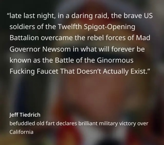 Calif has large investments in desal plants. Apparently though Mr. Trump is not aware of that and believes that there is a spigot he can order to be turned on somewhere up in the PNW that can then magically flow down to Calif. His disconnect with reality just boggles the mind.